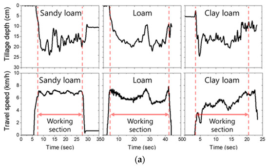 The tillage depth and travel speed results during moldboard plowing are shown in Figure 5a. The overall mean tillage depths of each test field were 17.5 2.8 cm in sandy loam, 16.3 3.1 cm in loam, and 15.2 3.6 cm in clay loam. As a result of the measurement data analysis, it was confirmed that the tillage depth was properly carried out in the hardpan range based on cone penetration test results (12–20 cm). In the case of the travel speed, the overall mean travel speed of each test field was 6.9 0.1 km/h (6.8–7.1 km/h) in sandy loam, 6.2 0.5 km/h (5.5–6.9 km/h) in loam, and 4.8 0.4 km/h (4.1–5.6 km/h) in clay loam. Based on these results, it was confirmed that the travel speed decreased in the range of 12.7–39.2% from the theoretical speed of 7.9 km/h in M3 gear selection due to the influence of soil properties at a tillage depth of 20 cm. It was confirmed that the travel speed result at a tillage depth of 20 cm of clay loam was reduced by 0.57 times compared to that of sandy loam at a tillage depth of 12 cm, as shown in Figure 5b.