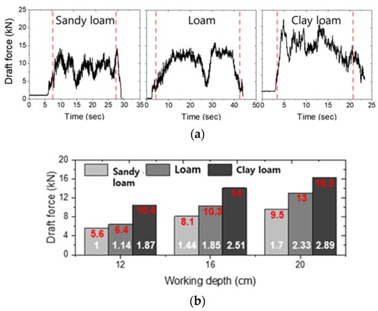 The results of draft force according to tillage depth and test sites are shown in Figure 6a. The overall mean draft force in each test field was 8.1 1.4 kN (5.6–9.5 kN) in sandy loam, 10.1 2.5 kN (6.4–13 kN) in loam and 13.9 2.5 kN (10.4–17.7 kN) in clay loam. Compared to sandy loam, loam and clay loam showed 1.24 times and 1.71 times higher overall mean draft forces in the hardpan section. This confirms that various working environments were highly affected by the draft force according to tillage depth. As shown in Figure 6b, it was confirmed that the result at a tillage depth of 20 cm of clay loam increased rapidly by 2.89 times compared to that of sandy loam at a tillage depth of 12 cm.