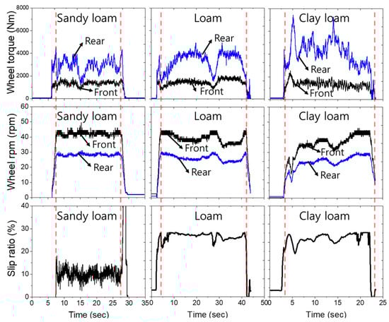 The wheel axle load and slip ratio results are shown in Figure 8. The overall mean front wheel axle torque in the tillage depth section of 12–20 cm was 1297.7 129.3 Nm (1085.6–1448.4 Nm), 1461.9 164.5 Nm (1224.4–1662.3 Nm), and 1373.1 61.1 Nm (1246.3–1453.2 Nm) in sandy loam, loam, and clay loam, respectively. In the case of the front-wheel axle torque, the average torques of loam and clay loam were almost similar. The overall mean front wheel speeds in the tillage depth section of 12–20 cm were 42.6 0.4 rpm (42.1–43.5 rpm), 39.8 2.4 rpm (35.8–43 rpm), and 34.6 1.9 rpm (31.3–38.1 rpm) in sandy loam, loam, and clay loam, respectively. The wheel axle rotational speed was affected by the decrease in engine speed, so when the tillage depth increased from 12 to 20 cm, it decreased up to 4.3%, 10.4%, and 22.3% at sandy loam, loam, and clay loam, respectively, compared to the wheel speed under driving load conditions.
