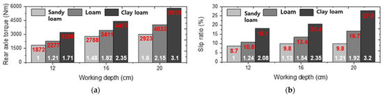 In addition, the overall mean slip ratios of each test field were 9.5 0.5% (8.5–10%) in sandy loam, 13.4 2.4% (10.1–16.7%) in loam, and 22.3 3.8% (18.1–28%) in clay loam. The overall average slip ratios of loam and clay loam were 1.41 times and 2.34 times higher than those of sandy loam, respectively. As shown in Figure 9b, the mean slip ratio of up to 1.92–3.2 times higher occurred in loam and clay loam compared to that of sandy loam at a tillage depth of 12 cm, which had the lowest average slip ratio. Normally, traction of off-road machinery is defined as the ability of the vehicle’s wheel to develop efficient soil thrust force to overcome resistance force (e.g., draft force) [47,48]. In other words, the higher the soil resistance, the lower the traction force and the higher the slip ratio. From the test results, it is judged that a higher draft force occurred in clay loam, resulting in a higher slip ratio than in sandy loam and loam.