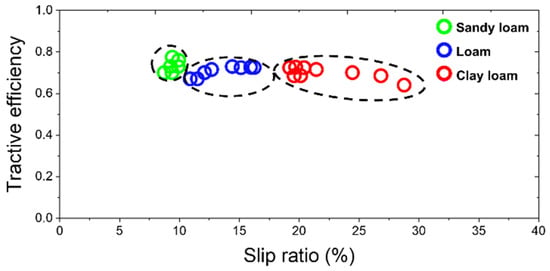 Depending on the field environment conditions, the traction performance was basically affected by the average 2.3 times increase in the slip ratio occurrence range. As shown in Figure 10, the overall mean tractive efficiency in the tillage depth section of 12–20 cm was 0.7 0.02 (0.65–0.73), 0.68 0.04 (0.61–0.74), and 0.61 0.03 (0.56–0.66) in sandy loam, loam, and clay loam, respectively. As soil hardness and compaction increased over sandy loam to clay loam, it was confirmed that the average tractive efficiency decreased by an average of 12.9% and a maximum of 23.3%. Compared with the results of previous studies of slip-based traction performance curves [49], it was confirmed that the maximum tractive efficiency occurred at a slip ratio of 10%, and the overall data trend was that the tractive efficiency decreased as the slip ratio increased.