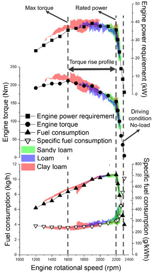 The engine load and fuel consumption results are shown in Figure 7a. The overall mean engine torque in the tillage depth section of 12–20 cm was 139.5 18.4 Nm (105.5–155.3 Nm), 165.1 24.3 Nm (124.9–192.5 Nm), and 201.5 16.3 Nm (167.4–225.9 Nm) in sandy loam, loam, and clay loam, respectively. As shown in Figure 7b, the engine torque increased up to 2.14 times compared to that of sandy loam at a tillage depth of 12 cm. The engine torque increased up to 2.14 times compared to that of sandy loam at a tillage depth of 12 cm. The engine speed showed a tendency to decrease rapidly as the tillage depth increased. The smallest reduction in engine speed was from 2236.2 rpm to 2176 rpm in sandy loam (up to a 1.1% reduction compared to the rated engine speed). In the case of loam, the engine speed decreased from 2213.9 rpm to 1902.7 rpm (up to 13.6% reduction compared to the rated engine speed). The maximum engine speed decreased from 2024.9 rpm to 1668.3 rpm in clay loam (up to 25.4% reduction compared to the rated engine speed).