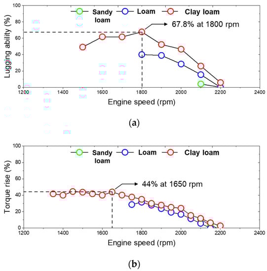 The maximum torque of the tractor engine used in this study was 211.8 Nm at 1600 rpm. The engine torque was measured in the ranges of 50–73.6%, 59.1–91.2%, and 50–107% compared to the maximum engine torque at sandy loam, loam, and clay loam, respectively. Therefore, when a maximum draft force of 17.7 kN occurs under certain soil property conditions at the clay loam using a 6-row moldboard plow, it was determined that there was a 67.8% lugging ability that enables continuous operation even when the engine torque increase rate was increased to a maximum of 44% compared to the engine rated torque of 140 Nm at 2200 rpm, as shown in Figure 12.