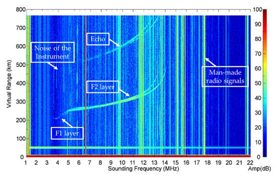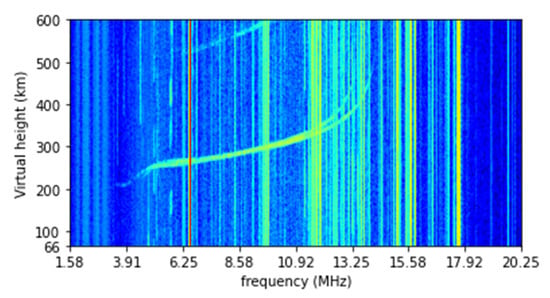 The ionograms we use in this work were acquired from the VIPIR ionosonde located at Hualien, Taiwan (23.99° N, 131.61° E). The time resolution is 2 min [1], sweeping frequency is from 1 to 22 MHz, the virtual height range is from 0 to 800 km, and the amplitude of the signal is measured in the range of 1 to 100 dB. The dimension of the original ionograms is 2300 pixels in frequency and 1700 pixels in virtual height. A typical example of ionograms is shown in Figure 1. It can be seen that the ionogram contains not only signals but also noise and contamination.