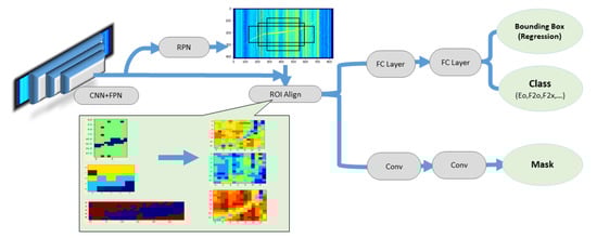 The architecture of Mask R-CNN is illustrated in Figure 3. The model consists of three main parts: Backbone, which is composed of convolutional neural network and feature pyramids network (CNN + FPN), region proposal network (RPN), and region of interest align (ROI Align).