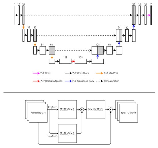 Spatial attention U-Net (SA-UNet) was developed by Guo et al., 2019 and Guo et al., 2021 [15,16], who have demonstrated their capability in identifying tiny or elongated features. The model (illustrated in Figure 4) has a U-Net architecture with five major components: the convolution block, maximum pooling, spatial attention module, transpose convolution layer and skip connection.