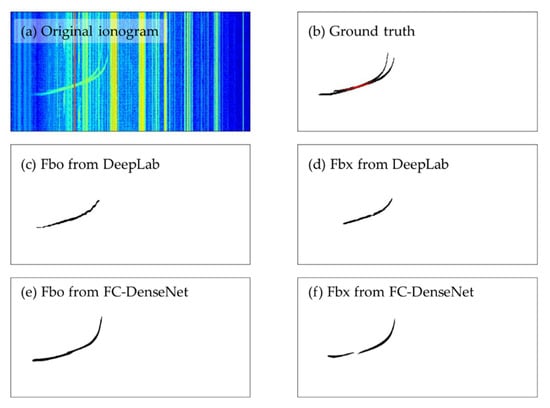 An example of the overlapping ordinary and extraordinary signals from the F2 layer: (a) the original ionogram; (b) the ground truth labeled in the original ionogram (black pixels are the non-overlapping part and red pixels the overlapping part of the signals); (c,d) the output of DeepLab for Fbo and Fbx, respectively; (e,f) the output of FC-DenseNet for Fbo and Fbx, respectively.