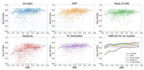 Comparison of IoU of Fbo vs. SNR for all models (different colors represent different models: blue: SA-UNet, orange: DWT, green: Mask R-CNN, red: DeepLab, purple: FC-DenseNet).