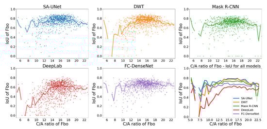 Comparison of IoU of Fbo vs. C/A ratio for all models (different colors represent different models: blue: SA-UNet, orange: DWT, green: Mask R-CNN, red: DeepLab, purple: FC-DenseNet).