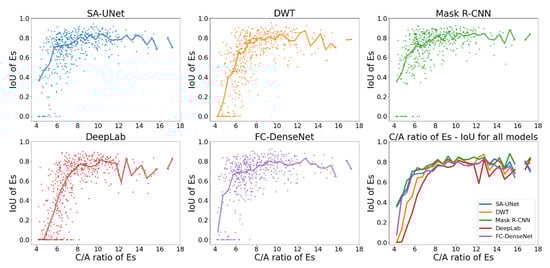 Comparison of IoU of Es vs. C/A ratio for all models (different colors represent different models: blue: SA-UNet, orange: DWT, green: Mask R-CNN, red: DeepLab, purple: FC-DenseNet).