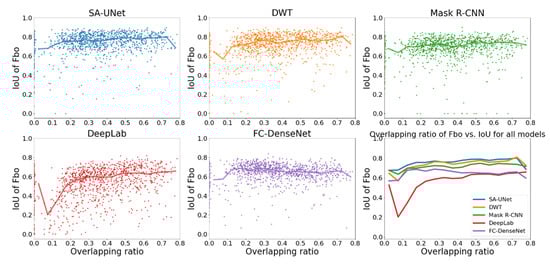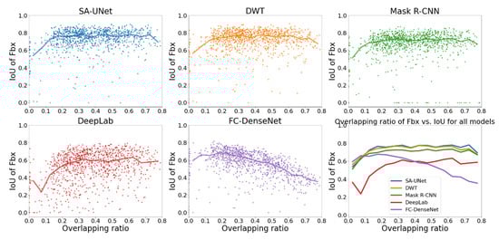 The figures show that, except for DeepLab and FC-DenseNet24, the median IoU of other models are higher than 0.6 for both Fbo and Fbx regardless of the overlapping ratio, indicating that SA-UNet, DWT, and Mask R-CNN can well-identify both Fbo and Fbx irrespective of how much the two overlap.