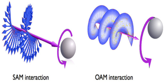 Wireless communication systems such as Visible Light Communication (VLC) have proven to increase spectral efficiency and provide reliable data connections at higher data rates. However, the channel model in VLC can be free space or underwater. The increase in the channel non-linearities that affect the performance of the system requires receiver designs to be more complex [1]. It becomes more challenging when the communication system involves more variables to be estimated. The traditional equalizers and receiver designs can mitigate these effects to some extent. However, Artificial Intelligence (AI) has been proven to be effective in wireless communication systems for modulation detection, jitter mitigation, nonlinearity mitigation, and phase estimation [1,2,3]. Next-generation communication systems are expected to be reliable, robust, spectrally efficient, and fast, which can accommodate the demand of increasing users without sacrificing system performance. Furthermore, the requirements such as environmentally friendly properties, power, and bandwidth efficiency are also top of the chart. Visible Light Communication (VLC) (also known as Li-Fi) is related technology that is a solution to meet these requirements for next-generation communication systems. VLC systems are based on visible light sources, such as Light-Emitting Diodes (LEDs), which are environment friendly and have the spectrum range of 380–780 nm, i.e., a non-interfering range with Radio Frequency (RF)-based communication systems. Despite numerous advantages, VLC systems also face the challenge of handling a large number of users in the context of multiuser communication. It is worth noting, however, that the Orbital Angular Momentum (OAM) of RF waves has been recently the focus of the researchers because of its helical phase wavefront due to successive phase shifts in space [4,5,6,7,8,9]. Similar to the RF waves, the photons of the visible light beam can create a helical phase waveform with a phase front of for the azimuthal angle, , per photon [10]. It is important to mention that OAM is not similar to Spin Angular Momentum (SAM). SAM is associated with circular polarization, and OAM is associated with the spatial distribution of photons as shown in Figure 1. The successive phase shifts create orthogonal OAM modes, which are the key feature of OAM waves, and make multiplexing and demultiplexing the OAM easy with less interference.
