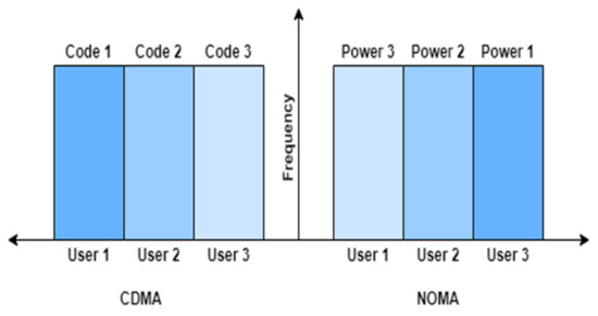 To accommodate multiple access in VLC systems, multiple techniques have been proposed in the literature, such as OFDM, Time-Division Multiple Access (TDMA), and Code Division Multiple Access (CDMA) [17,20,21,22,23,24,25]. The source allocation for CDMA and PD-NOMA is shown in Figure 2. In [26], MIMO-OFDM is used for multiuser VLC systems by assigning a single carrier to each user. Similarly, in [11], CDMA is used with OFDM to accommodate multiuser communication instead of the single carrier to each user. These systems have performed very well. However, there are some inherent drawbacks in these techniques. For example, CDMA has degraded performance due to a low SNR among users. Similarly, Orthogonal FDMA (OFDMA) causes spectrum saturation and suffers from a high PAPR. In this research, we utilize PD-NOMA [27,28,29,30,31,32] because NOMA offers better spectrum efficiency, reduced latency, and massive connectivity. In PD-NOMA, the data of the users are suppressed using power difference. Each user’s signal is transmitted with a different and unique power value in the network. At the receiver end, the data of the user with the highest assigned power are recovered by normalizing the received signal with the assigned power factor, while SIC is employed for the retrieval of the data of the remaining users.