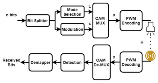 One of the advantages of OAM is the all-time availability of traditional resources, such as frequency and time, which can be used to increase spectral efficiency. The OAM wave has multiple orthogonal topological charges and provides a novel technique to dramatically boost spectrum efficiency, and, thus, it is predicted to be a potential multiplexing technique in future wireless communication networks. However, the disadvantage of OAM is the requirement of a high number of LEDs in order to achieve spatial orthogonality, which leads to an increase in the system’s complexity and power consumption. To combat this, the Index Modulation (IM) technique can be integrated with the OAM to increase spectrum efficiency while reducing power consumption at the same time [4,6,7]. IM is a type of digital modulation that uses the ON–OFF mechanism to assign some of the transmitted bits as the indices to other transmitting bits.