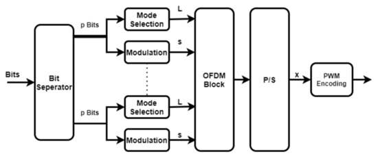 where is the floor function, used to avoid errors due to the decimal in log operation. The number of bits used for modulation is , and shows the number of bits used for mode selection by index modulation as shown in Figure 3. The signal applied to the LED is given as follows: