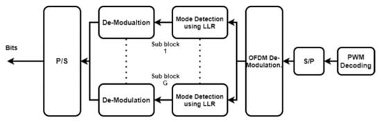 is the final output of the modulation block. The signal is passed by the PWM-encoding block to convert the complex signal into 1s and 0s to drive the LEDs. Then, the signal is transmitted through the VLC channel. The signal is detected by the photodetector, and the signal is processed through PWM decoding to convert the 1s and 0s in complex symbols for further processing. Therefore, the signal is passed through the inverse discrete Fourier transform matrix [4,5,38]. The operations at the receiver end can be written as follows: