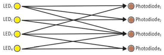 Visible light passes through the optical medium for the transmission of data through LEDs to photodetectors. VLC systems experience multiple challenges during the propagation phase, such as shadowing when the illumination location becomes blocked from a certain region. This can also lead to information loss. The LoS and diffused components of propagating visible light form the VLC channel. Figure 6 is an illustration of the VLC channel in MIMO configuration. The main sources of the diffused components in the VLC channel are the walls and other objects in the indoor environment [18].