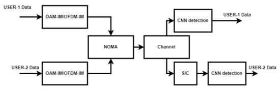 The development of 5G communication systems has already introduced several novel techniques, which highlights the need for techniques that are referred to as 6G or Beyond 5G (B5G) [30]. With the fast processing and increasing number of variables to be optimized in the communication system, implementation complexity increases. Even with a known channel, the accuracy of detection declines with the increase in the number of users. In the case of IM and its variants with OAM and OFDM, detection methods become complex with an increasing number of users and a different activation mode because the signal power of activated modes reduces, and it becomes difficult for traditional methods to accurately detect. In this regard, AI has played an important role due to its capabilities of learning the environment and channel conditions to improve detection accuracy. The system’s performance increases, as the algorithm can learn in contrast to traditional methods that use one-time mathematical function definitions. In [35], VLC-based indoor positioning systems using KNN, ANN, and clustering are discussed, and the effectiveness of these techniques is given. In [36], regression in machine learning is used for indoor positioning using a VLC system. To improve the overall performance of VLC systems, [37] presents machine learning techniques to mitigate non-linear effects. Inspired by the advantages of the low bit-error-rate (BER), low complexity, and high data rate mentioned in the recent literature, we implement OAM-IM and OFDM-IM with a CNN-based approach for SIC to retrieve data for a NOMA-based multiuser VLC system.