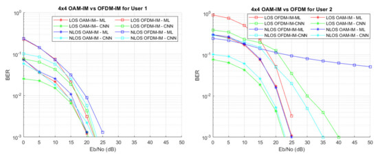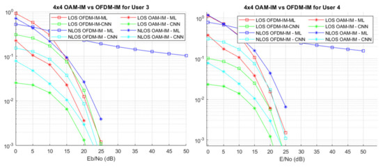 Figure 10 shows very interesting results for user 3 and user 4. Above all, these curves imply that the superior performance of OAM-IM is consistent and is not affected by the increase in the number of users by and large. It can be seen that the difference between OAM-IM and OFDM-IM for a low SNR in Figure 10 is comparatively low; however, as the SNR values are increased, OFDM-IM performance starts to decrease. By contrast, OAM-IM maintains its performance, even for high SNR values. It can be observed that OAM-IM outperforms OFDM-IM for both LoS and NLoS VLC channels. The benefit that OAM-IM has an edge in the sense of spectral efficiency, which is difficult to achieve in OFDM-IM, is also highlighted here. The performance of OFDM-IM with low power degrades when using the maximum likelihood detection method; however, CNN-based receiver design improves the BER for both LoS and NLoS VLC channels for all ranges of SNR values. The results show that the CNN-based receiver design performs better than the ML method. The CNN-based system improves the detection rate by up to 20% and 30% for low and high SNR values, especially for low-power users. The CNN-based VLC system is practically suitable for a higher number of users and activation modes because, due to the increasing number of elements to be optimally detected and the avoidance of interference ML-based systems, system complexity is heightened, which leads to a high computational cost and higher chances of system failure. It is important to mention that, for these results, the channel matrix is known and assumed to be static.