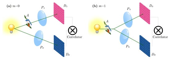 where denotes the complex conjugate of the amplitude transmissivity, and and are the transverse coordinates on the object plane [17,21,23]. The integer coefficient m and depend on the particular realization of CPI. If the object is placed only in one of the two arms, as in Figure 1a, then . Instead, if light crosses the object before it is split towards the detectors, as in Figure 1b, then . The complex function represents the point spread function of CPI and depends both on the light source, and on the configuration of the optical paths [17,21,23]. Within are enclosed all the details about the field propagation through the optical components, and also the coherence properties of the source [24]. The expression of is analyzed extensively in Refs. [17,21,23]. For our purpose, it is sufficient to consider it as a second-order transfer function [25], describing the (back-)propagation of a correlated detection at coordinates on and on towards the object plane. Let us now make a few assumptions and approximations that enable simplifying Equation (4) and relating the aperture function A to the coordinates on the detectors, namely, establishing a relationship between the two detectors and the object plane. We consider in the paraxial approximation [25] and assume perfect mode-to-mode correlation [24] (i.e., infinitesimal transverse coherence area) on the source. Furthermore, all the apertures in the setup are assumed to be infinite (including the source transverse size), so that has an analytical expression, and the two double integrals on the object plane are easily solved in the asymptotic limit of geometrical optics [21]; in this limit, the result of all integrals can be approximated by applying a stationary phase method [26]. Since all optical propagators in the paraxial approximation involve phases that are, at most, quadratic in the integration variables, all functions come out to depend on linear combinations of the detector variables. In fact, the correlation function reduces to: