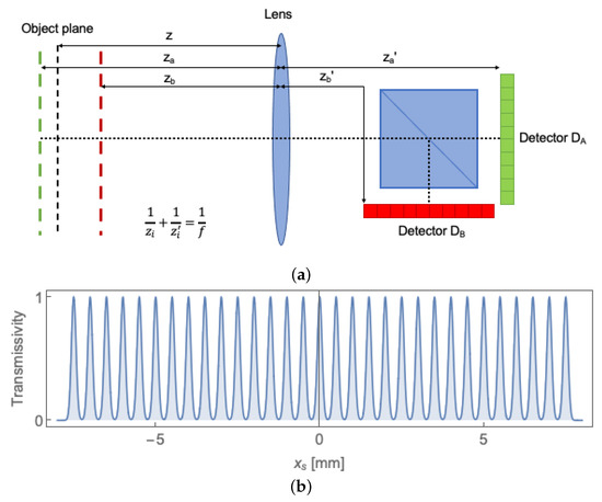 To offer a graphical representation of the correlation function, we shall now consider a particular CPI scheme, named CPI between arbitrary planes (CPI-AP) [23]. The peculiarity of this configuration is that two planes in the proximity of the object are imaged by the two sensors at a diffraction-limited resolution. In Figure 2a, we report the specific single-lens realization of CPI-AP that will be employed in all simulations. Here, light emitted by a two-dimensional object, such as a fluorescent sample, propagates towards a lens whose focal length is ; after the lens, the light beam is split towards two detectors and , endowed with spatial resolution. The two lens-detector distances are such that the conjugate plane of detector is at a distance from the lens, with magnification , and the conjugate plane of detector is at a distance on , with magnification . The object, placed at a distance z from the lens, is modeled as an infinitely extended distribution of equally-spaced Gaussian apertures, having center-to-center distance equal to and width equal to , as reported in Figure 2b. The size of the detectors is .