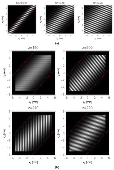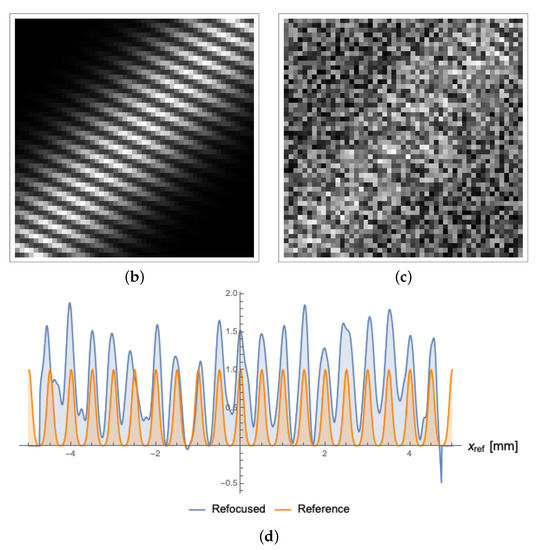 Figure 5b displays the effect of pixelization by considering the same object and setup as in the previous section, and choosing a pixel size of . In this condition, based on Equation (18), an object with a spacing of is expected to produce lines that are separated by roughly two pixels in the plane, in good agreement with the result shown in the figure.