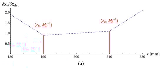 This expression reduces to the one known for conventional imaging when the object is on focus (), that is, when or , where and are the magnifications on the conjugate planes of detectors and . Unlike conventional imaging, however, Equation (18) implies a dependence of the resolution on the axial position z of the unfocused object. In particular, the coefficients and can diverge at large distances from the focused planes, as in the example chosen for the simulations. Similar to conventional imaging, both the pixel size and the finiteness of the point-spread function imposes limits on the maximum achievable resolution. A plot of the pixel-limited resolution, normalized over the pixel size (supposed to be equal on the two detectors) is shown in Figure 5a.