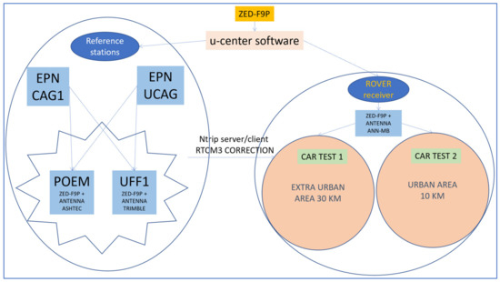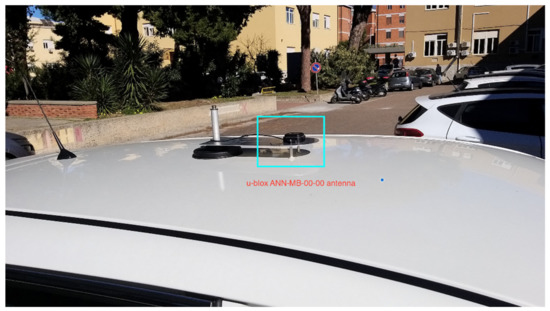 The rover receiver was placed on the car roof firmly locked with a magnetic mount and was provided with a metal plate at the base of the u-blox antenna (Figure 7). The antenna cable arrived inside the car where the ZED-F9P was housed and connected via the USB port to a Win10 pc/tablet, where the u-center software was running. The rover was set to acquire satellites with a cutoff of 10°. A wireless connection to a popular telephonic company provided the internet link. Using the Ntrip client integrated in the u-center software, we connected it to the Ntrip server.