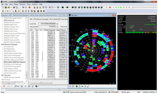 Starting from these results, the present study aims to assess the possibility that these receivers can work as spare units or even upgrade a real infrastructure of a network of permanent GPS stations to make it a multi-constellation network. In this case, the u-blox base or master [21,22] station would take advantage of the geodetic-grade antennas already present in the reference stations of the network. It is clear that it is necessary not only for the availability of the hardware but also of a very complete and well-organized software package that allows us to configure and evaluate all the possible performances of the receiver.