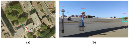 The second reference station, named UFF1, was set up roughly twelve meters away from the CAG1 EPN station. UFF1 was equipped with a Trimble’s Zephir Geodetic 2 antenna [28], the same as those present in the network of GPS permanent stations. The antenna supports all bands (L1/L2/L5/G1/G2/G3/E1/E5ab/E6/B1/B2/B3) to which the receiver under investigation is connected. In this case, the ZED-F9P receiver was able to power up the antenna, which required a voltage of at least 3.5 V. The ZED-F9P receiver, in turn, was powered by the PC where the u-center resides. Figure 4 shows the position of the UFF1 reference station on the terrace of the building (a) and in relation to the EPN reference stations (b).