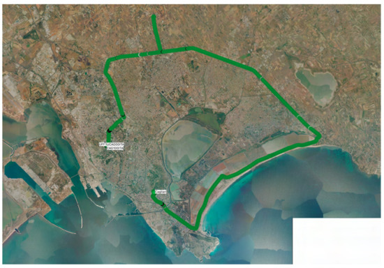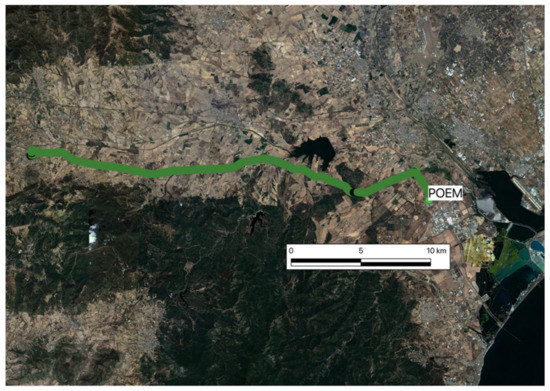 Two car tests were carried out: “car-test 1” and “car-test 2”, characterized by different environmental/geographic conditions. The car-test 1 route was carried out on an extra-urban road, characterized by variable orographic conditions (from flat to mountainous) (Figure 5). The car departed from the Sardegna Ricerche base, where the reference station POEM was housed, and drove westwards for approximately 30 km. At the furthest point from the permanent station, we crossed the small town of Villamassargia (CA). After stopping for a few minutes, we resumed our journey to the starting point in POEM. A total of approximately 64 km were covered.
