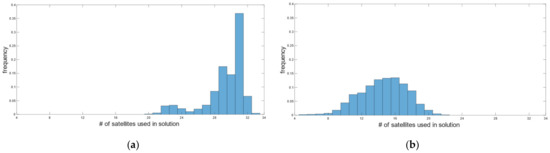Car test 1: distribution of the number of satellites used in real-time positioning (a) and in the post-processed RTKLib solutions (b).
