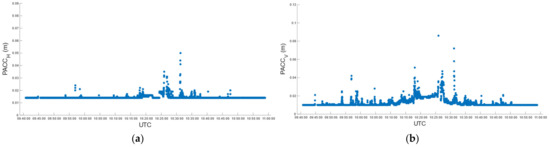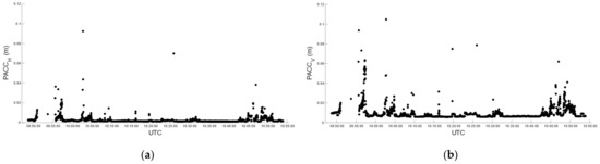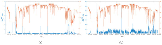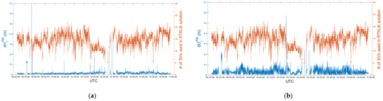 Finally, according to (3) and (4), we compared the post-processed coordinates with the real-time ones, evaluating differences in terms of the horizontal and vertical components. Mean differences in e, n and u were 2.4 mm, 4.9 mm and −0.8 mm, respectively. Moreover, despite a few peaks, 95% of differences were below 30 mm in the horizontal component and 90 mm in the vertical component. Figure 11 shows horizontal (a) and vertical (b) differences between real-time and post-processed positions, related to the number of satellites (SVs) used in post-processed solutions.