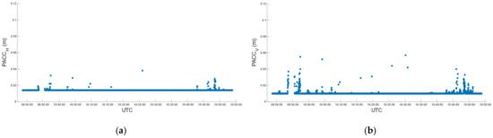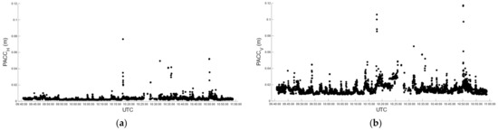 Applying the global to local-level system transformation (1) to the vector , we obtained the NEU component of the difference between real-time and post-processed coordinates. Indicating with the NEU vector, we have: