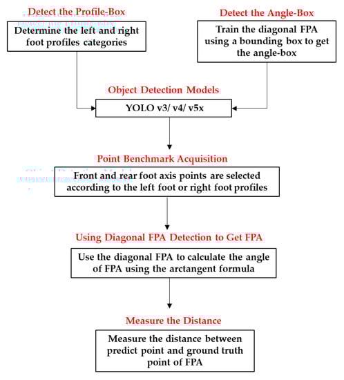 We conducted five steps to get the FPA (Figure 1) from the data training into calculating the angles. First, we needed to determine the foot profile because the diagonal FPA direction of the left and right foot was different. Second, we trained the diagonal FPA using a bounding box to get the angle-box. The box itself has four corner points in its detection. Third, detecting four angle-box corner points in the diagonal FPA requires acquiring two points (front and rear foot axis points) selected according to the left foot or right foot profiles. Fourth, we used the diagonal FPA to calculate the angle of the FPA using the arctangent formula. Fifth, to confirm our two-foot axis point coordinate predictions, we checked the distance between the predicted and ground-truth points.