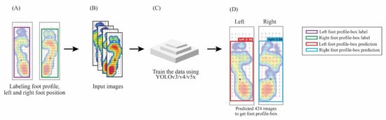 The illustration of profile-box for left and right foot in plantar pressure image detection with the YOLO model. (A) Labeling the foot profile in left and right categories using the bounding-box. (B) Input the data labeled for training. (C) Training the dataset using YOLOv3, v4, and v5x. (D) The prediction test used 424 images to get the foot profile-box.