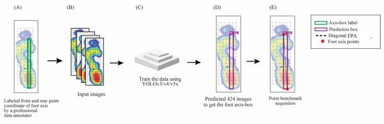 The illustration of angle-box for foot progression angle (FPA) in plantar pressure image with the YOLO model. (A) The dataset is labeled by the professional annotator (B). Input the data of labeled images. (C) Training using YOLOv3, v4, and v5x. (D) testing the 424 images to get the foot angle-box. (E) Determine the foot axis point acquisition based on the foot profile-box.