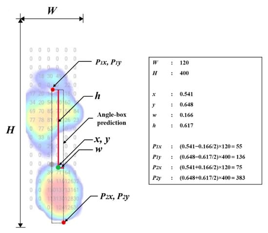 where P1x, P1y represent the front foot axis point coordinates and P2x, P2y represent the rear of the foot axis point coordinates. The center of the box coordinates is x and y, the width and height of the bounding box are w and h, width and height of the images are W and H (Figure 4). While P1x and P1y are the top left corner coordinates for the left foot and the top right corner for the right foot. The lower right corner coordinates for the left foot and the lower-left corner for the right foot are P2x, P2y.