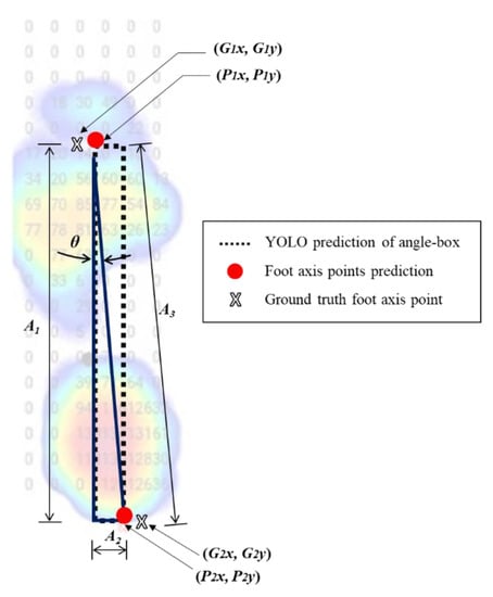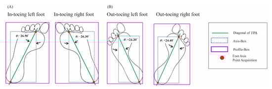 Furthermore, “point benchmark acquisition” was based on the angle-box. YOLO can detect the 4-corner coordinates of the angle-box prediction through the converting stage and then acquire the 2-point benchmark referred to as the foot position of the in-toeing foot direction (Figure 10) []. The left and right foot profiles of in-toeing determine the front and rear axis points used to get the diagonal FPA used to measure the angle of the FPA [].