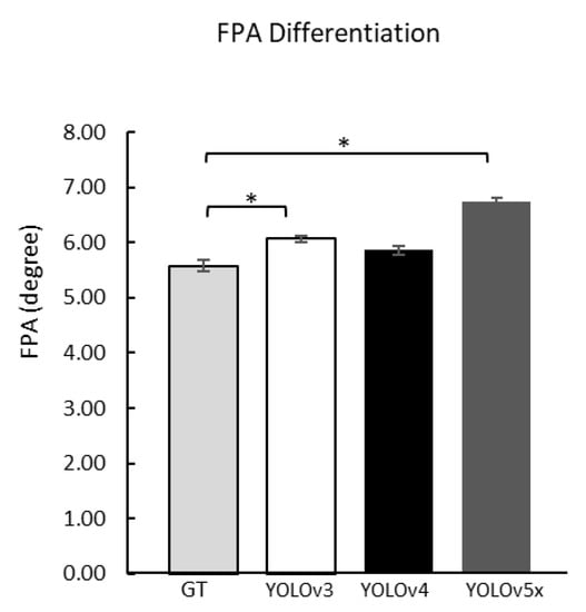 The total sample data is 424 images, while the usable sample data is 367 images. This was caused by 57 samples having missing values. Missing values occurred because the deep learning model could not recognize the image; the data were excluded from further analysis [,]. Compared with the FPA from the ground-truth, three versions of YOLO models were calculated using one-way ANOVA and LSD post hoc to get the angle differentiation. YOLOv4 FPA (5.86 ± 0.09°) did not show any significant difference compared to ground-truth (5.58 ± 0.10°) (Table 2). However, YOLOv3 and YOLOv5x were different compared to the ground-truth (Figure 6).