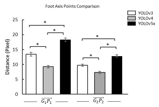 To confirm the foot axis point, we used paired t-test to get the distance differentiation between  and  in three YOLO models. Furthermore, we used one-way ANOVA and Fisher’s LSD post hoc to get the distance differentiation of three YOLO models on  and  (Table 3 and Table 4). The results showed that all comparisons were significantly different (Figure 7 and Figure 8).