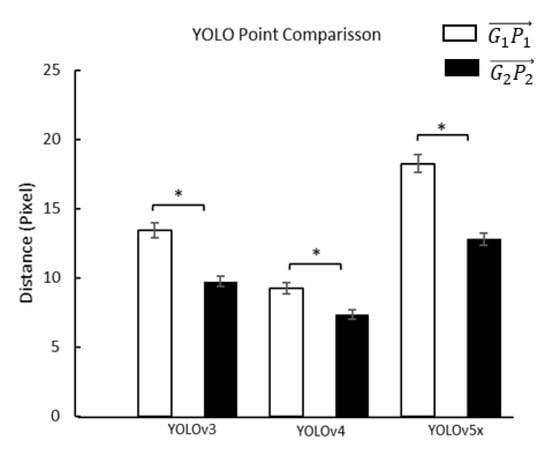 Comparisons of the front () and rear of the foot axis point () of the angle-box on the distances between ground-truth and prediction points in different YOLO models. , the distance between the front points of the ground-truth (G1) and YOLO model prediction (P1); , the distance between the rear points of the ground-truth (G2) and YOLO model prediction (P2); *, a significant difference (p < 0.01).