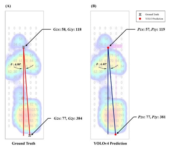 To evaluate the FPA results we found in YOLO models predictions, we used an example plantar image to test our results using angle calculations through digital image software (Photoshop CS.5, Adobe Inc., San Jose, CA, USA) by comparing the ground-truth with YOLO prediction results []. First, we measured the ground-truth coordinate and got the FPA. Second, we validated our prediction of the foot axis points coordinates and calculated the FPA. As a result, our forecast approached the ground-truth angle (Figure 9).