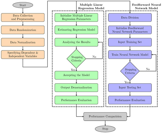 Thus, the ANN model based on MLP was developed using different training algorithms, transfer functions, and several neurons to determine the best prediction model. The results from the ANN have been compared with the results from the multiple linear regression (MLR). All models were trained and tested to achieve high accuracy in prediction. This paper is organized as follows. Section 2 presents the proposed system models for prediction. Section 3 presents the results and discussion. Lastly, Section 4 provides the conclusion of the study.