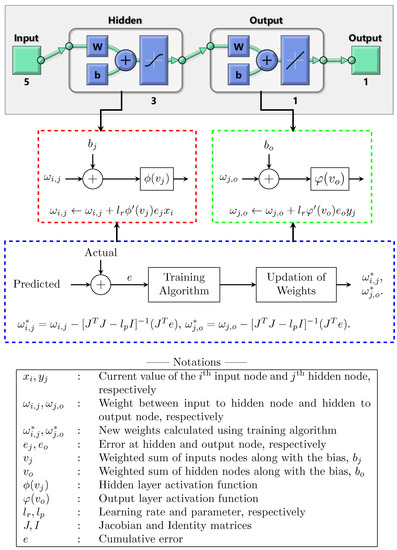 The feedforward neural network model adopted in this paper with a single hidden layer is shown in Figure 3. In the network model, the first and the last layers are the inputs (D, V, S, C, and A) and output (Saybolt Color) with five and one nodes, respectively. The middle layer is the hidden layer with three nodes. As an examplary case, the activation functions used at the hidden and output layers are, respectively, “tansig” and “purelin”. The mathematical formula of “tansig” and the delta rule to update weight, , are shown in Figure 3’s red dotted box. Similarly, the mathematical formula of the “purelin” and the delta rule to update weight are shown in Figure 3’s green dotted box. The non-linear and linear combination of functions was used to achieve efficient training [38,39]. Further, Levenberg–Marquardt’s approach was employed to calculate the new weights and during the training, as shown in Figure 3. Weight update rules using the algorithm for and are also shown in Figure 3 (blue dotted box).