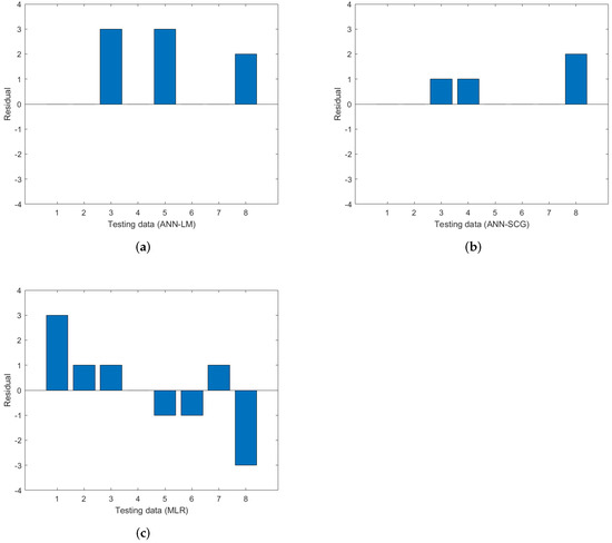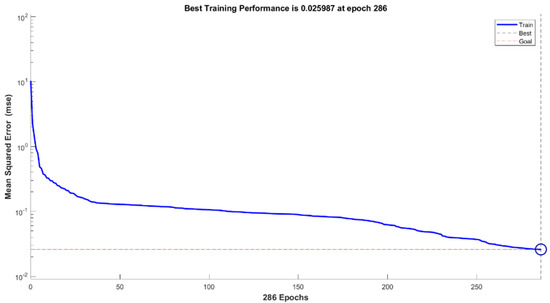 Each training iteration involves initial weights followed by output computation for all neurons, starting with the input layer. The number of iterations depends on the minimum value of the error function and stops when the error reaches sufficient values [20]. Default training parameters were employed for both LM and SCG—For instance, the number of epochs equal to 1000 and mean square error (MSE) as the performance function. Figure 4 presents one of the training error graphs of ANN models. The only set parameters were the performance goal (0.001) and minimum performance gradient . The values have been determined based on the average of the target data. Then, the training was iteratively performed in a loop of to obtain the best network for testing. The number of neurons is another parameter that was varied in this work. In a cause-and-effect prediction problem, the number of neurons in the input and output layer should correspond to the number of independent and dependent variables, respectively. There are, however, no rules to allow prior decisions to determine either the number of hidden layers or neurons [30]. Hence, to choose the suitable range of neuron numbers, a loop of neural networks with hidden neurons set from 1 to 10 was prerun using MATLAB before data training. The number of neurons chosen is critical because an insufficient number will cause difficulties in network learning, and an excessive number will result in unnecessary training time. On the other hand, the testing of MLR models involves the substitution of testing datasets into the equations obtained from training.
