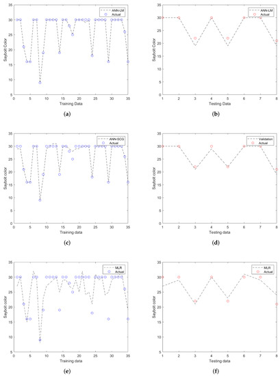 Comparison of actual and predicted Saybolt color of (a) training and (b) testing of ANN-LM, (c) training and (d) testing of ANN-SCG, (e) training, and (f) testing of MLR.