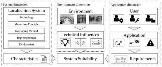 - Application dimension (Figure 1, right): To find a suitable system, the system performance must meet the requirements of the user. The type and level of requirements vary depending on the application and user. Sixteen potential user requirements, such as accuracy, latency, and integrity, are described by Mautz [4].
