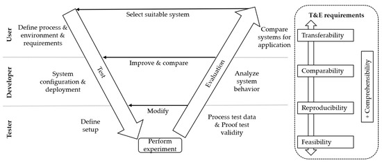 The V-Model—illustration of the application-driven T&E process with the involved stakeholders, their functions, and requirements.
