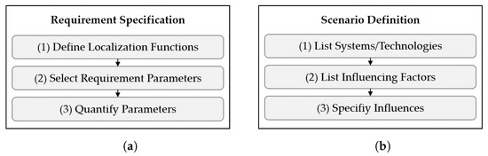 Methodologies are essential to support systematic test and evaluation and thus increase the meaningfulness of results. Methodologies for building-wide test and evaluation, such as the EvAAL Framework [12] and the EVARILOS Benchmarking Handbook [13], have been proposed. The ISO/IEC 18305 International Standard [14] was presented in 2016 to define a standardized procedure for test and evaluation of indoor localization systems with a focus on the end-user. Yet, publicly documented use of the named methodologies for test and evaluation is mostly limited to associated indoor localization competitions [7,15,16,17]. We published a work-in-progress paper on the topic of application-driven test and evaluation of indoor localization systems for warehouses for the Conference on Indoor Positioning and Indoor Navigation (IPIN) in 2021 [18]. This work expands the previously presented findings substantially by generalizing the methodology and by further elaborating all elements of the paper and the framework’s components.